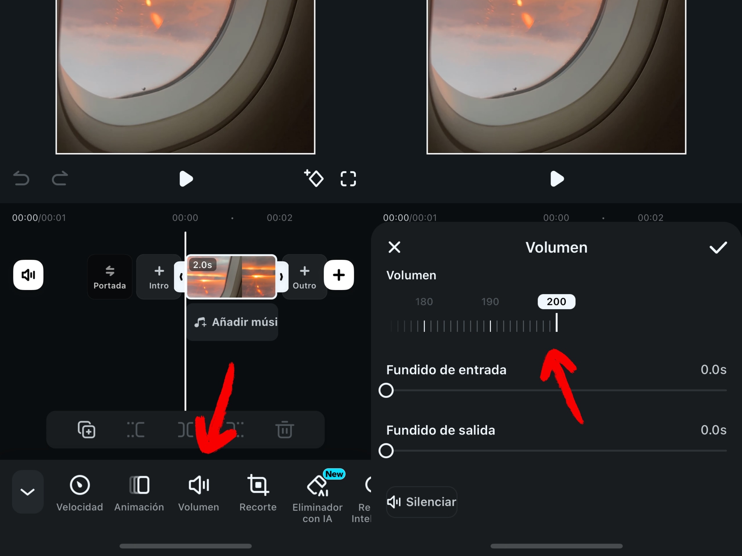 Paso 2. Selecciona el clip en la línea de tiempo y pulsa en “Volumen”. Luego, desliza el control hasta alcanzar el nivel deseado —puedes aumentarlo hasta 200%, que es el máximo recomendado para obtener un sonido más potente sin perder calidad.